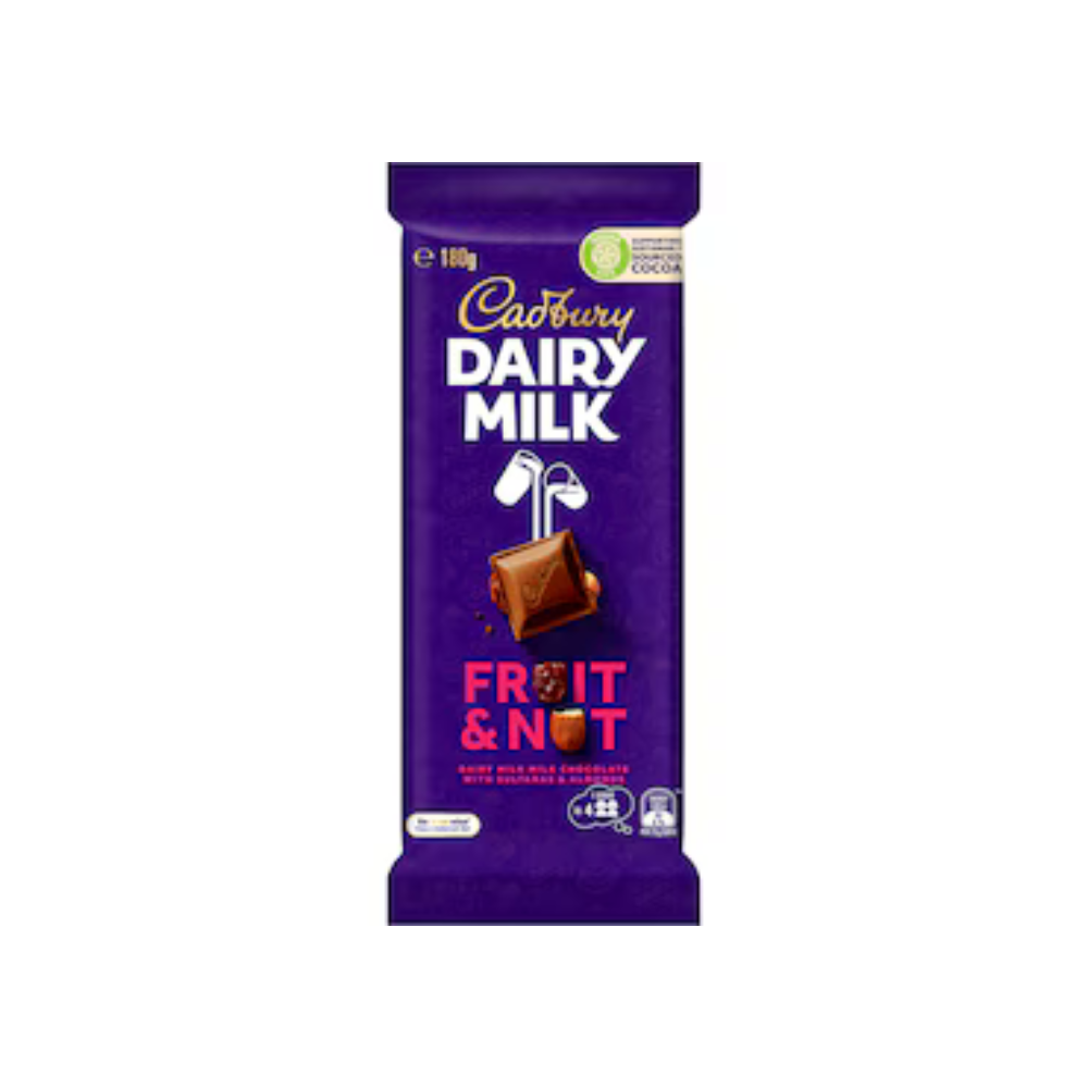 Indulge in the rich, velvety taste of the Cadbury Fruit and Nuts Chocolate Bar, a highly popular import from Malaysia. This generous block embodies the essence of classic Cadbury, made with the equivalent of “a glass and a half of full cream milk” for an exceptionally smooth and creamy melt-in-your-mouth experience.