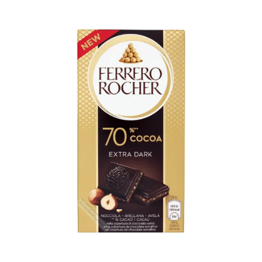 The Ferrero Rocher 70% Extra Dark Chocolate Bar offers an intensely refined dark chocolate experience, capturing the signature indulgent textures and flavors of the classic praline in a modern bar format. Crafted for connoisseurs of darker chocolate, it features a creamy filling and crunchy hazelnut pieces wrapped in a deep 70% cocoa shell.