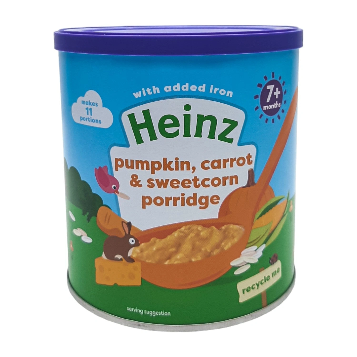 Heinz Pumpkin, Carrot & Sweetcorn Porridge is a savory, multigrain cereal designed for babies ready to transition to more exciting flavors and varied textures. This blend introduces the natural sweetness of root vegetables combined with a hint of cheese, making it a perfect meal for developing adventurous palates
